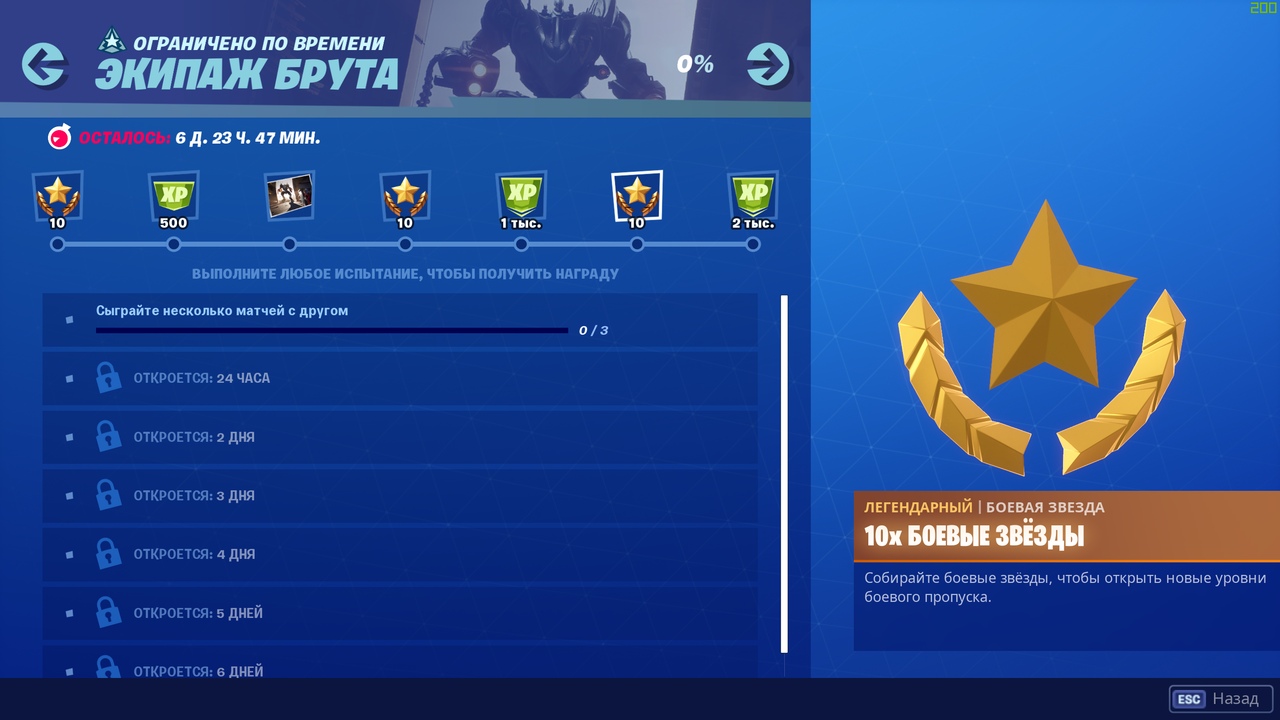 Награда за 6 любых успешно законченных испытания:10 звезд боевого пропуска