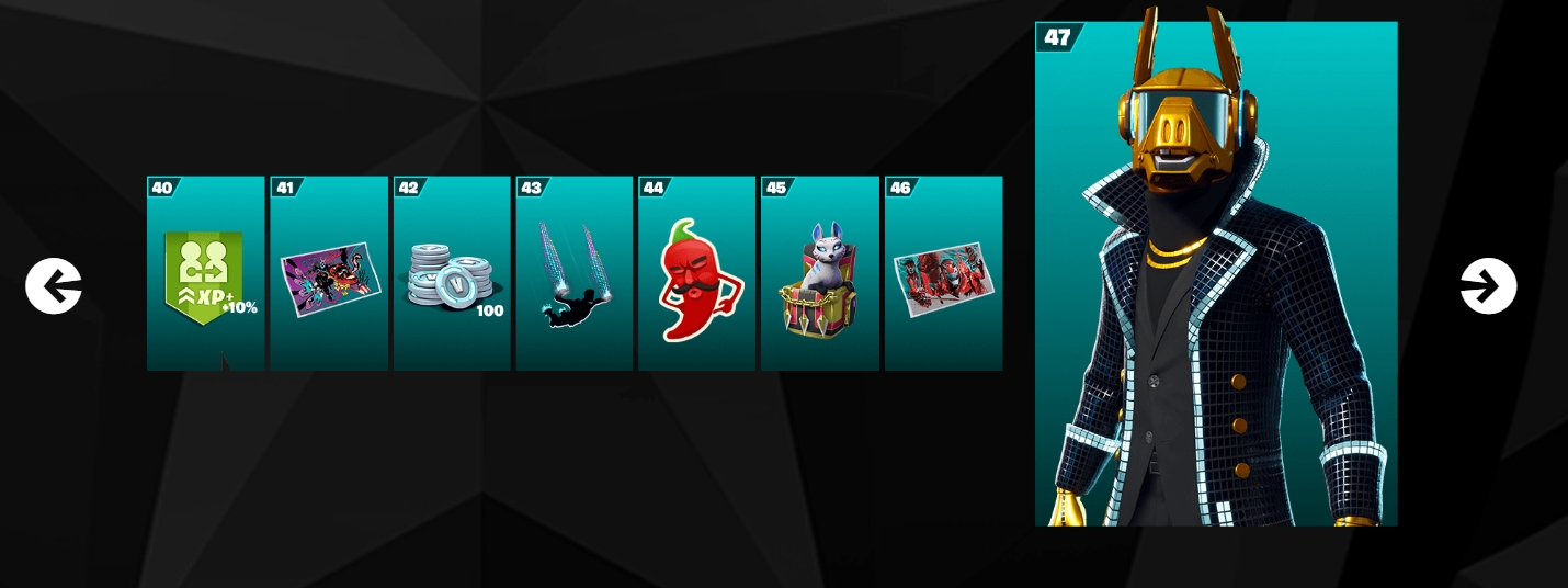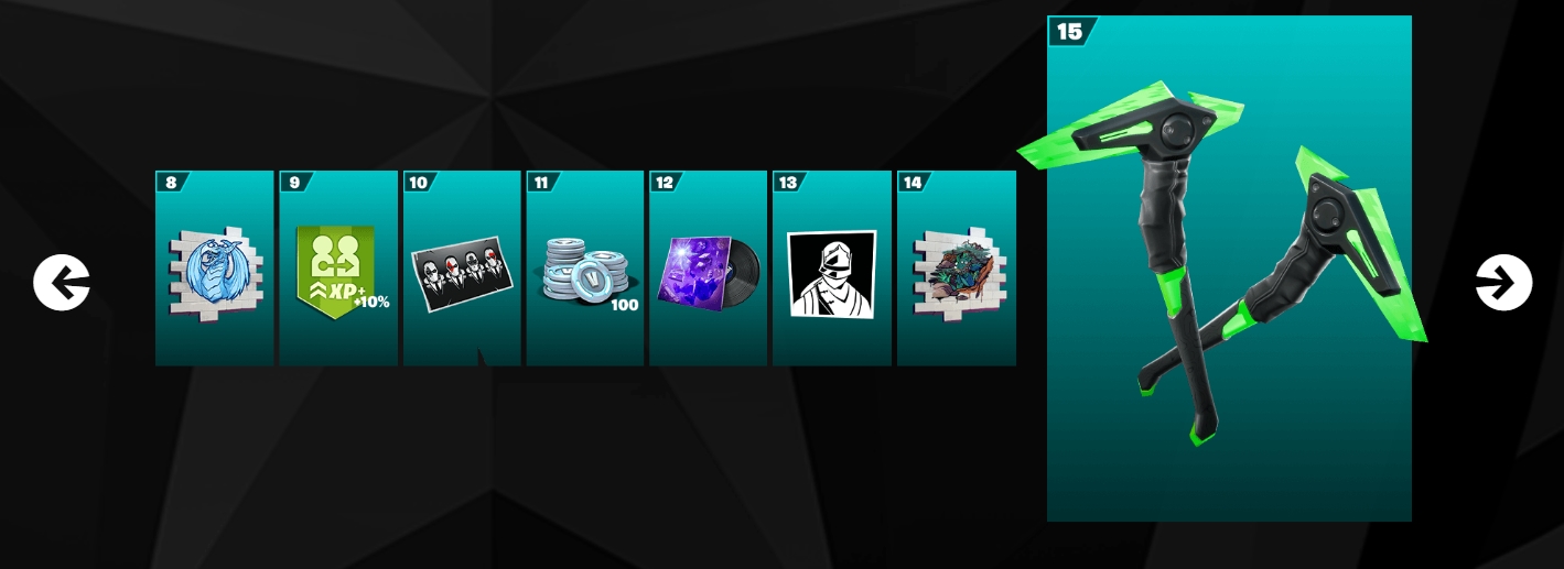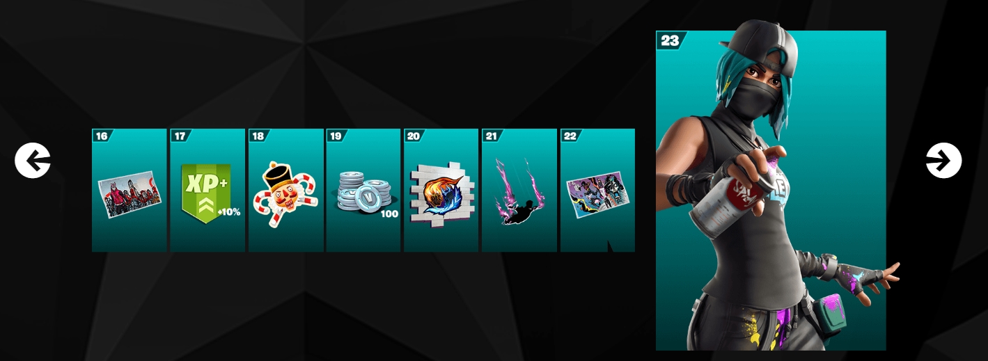 Боевой пропуск позволяет получить 7 скинов. Доступно много дополнительных скинов (некоторые бесполезны). Весь боевой пропуск дает возможность получить 1500 в-баксов.