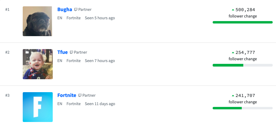 По словам TwitchMetrics, сольный победитель Кубка Мира Кайл “Bugha” Гирсдорф украл это место у Тенни, набрав более 500 000 подписчиков.